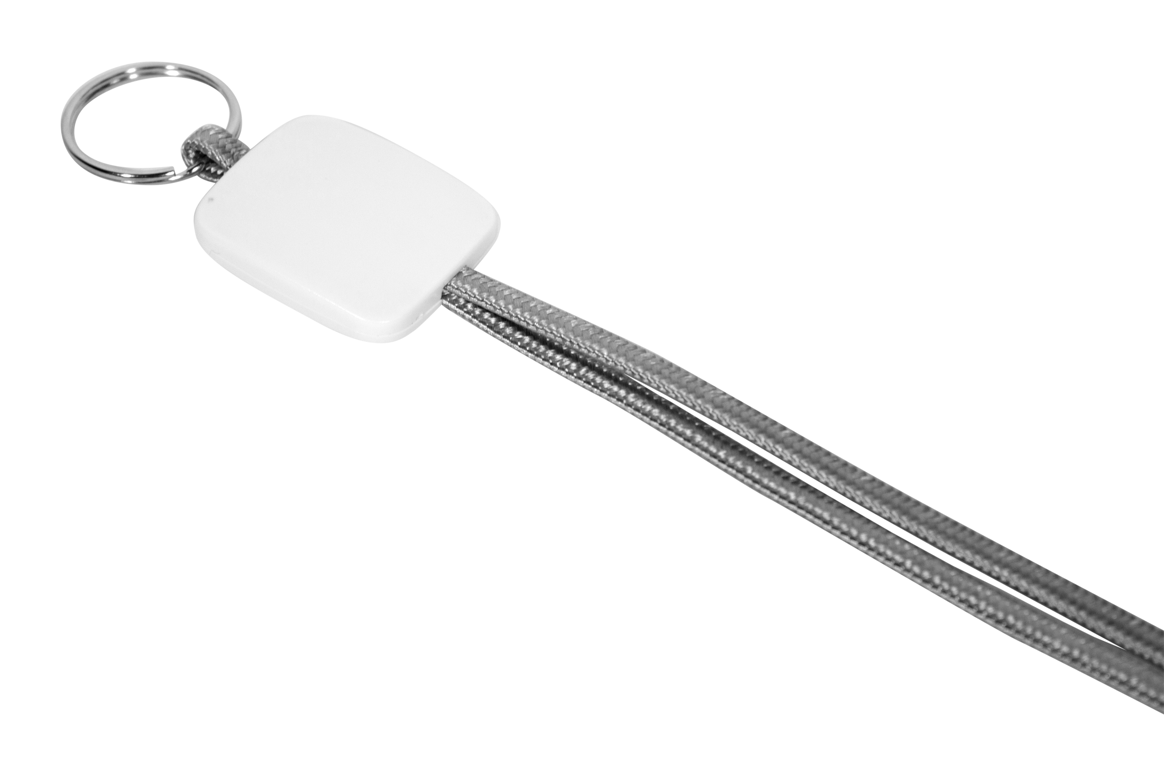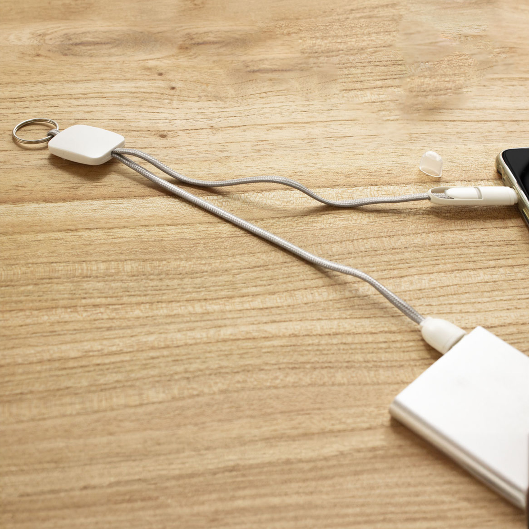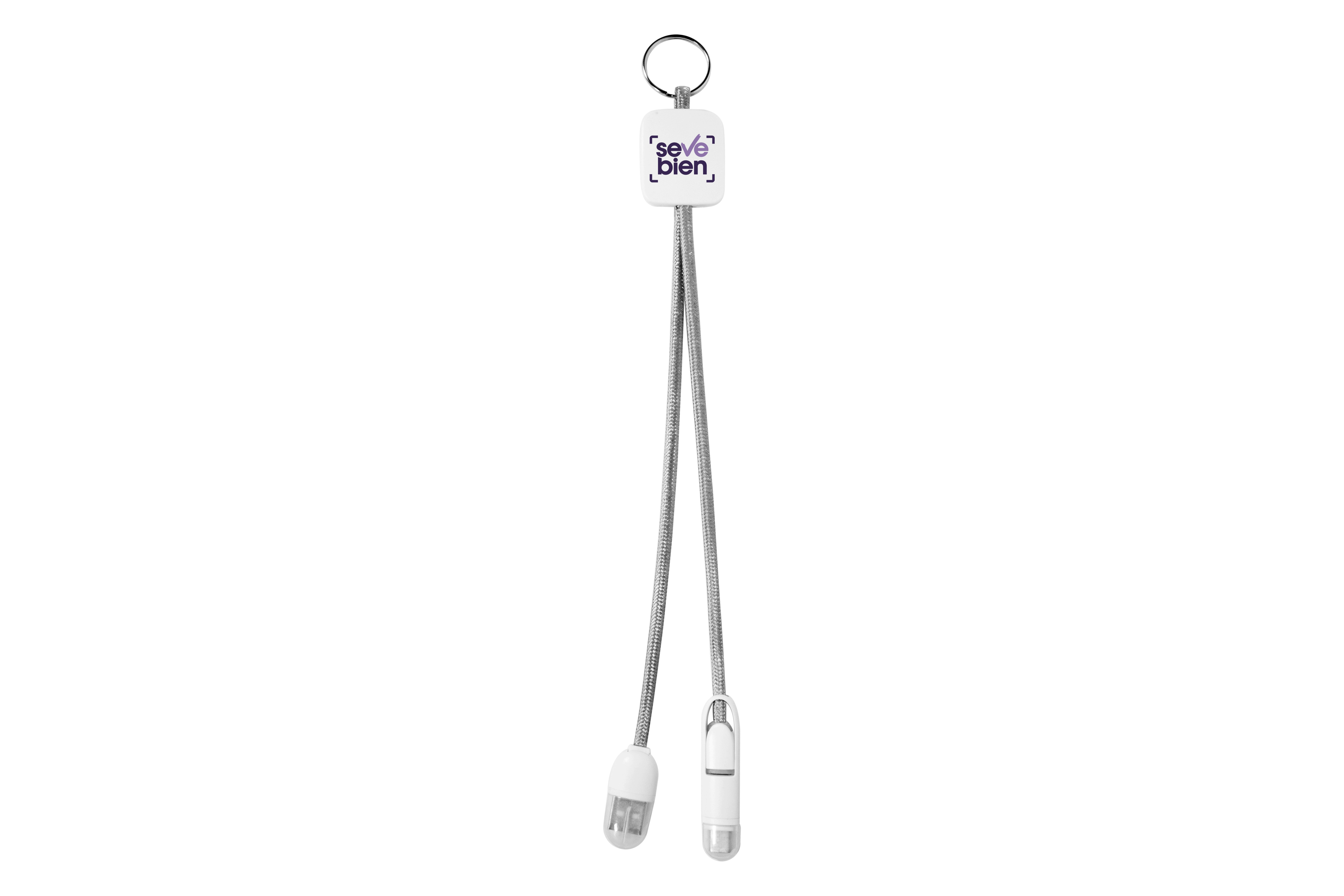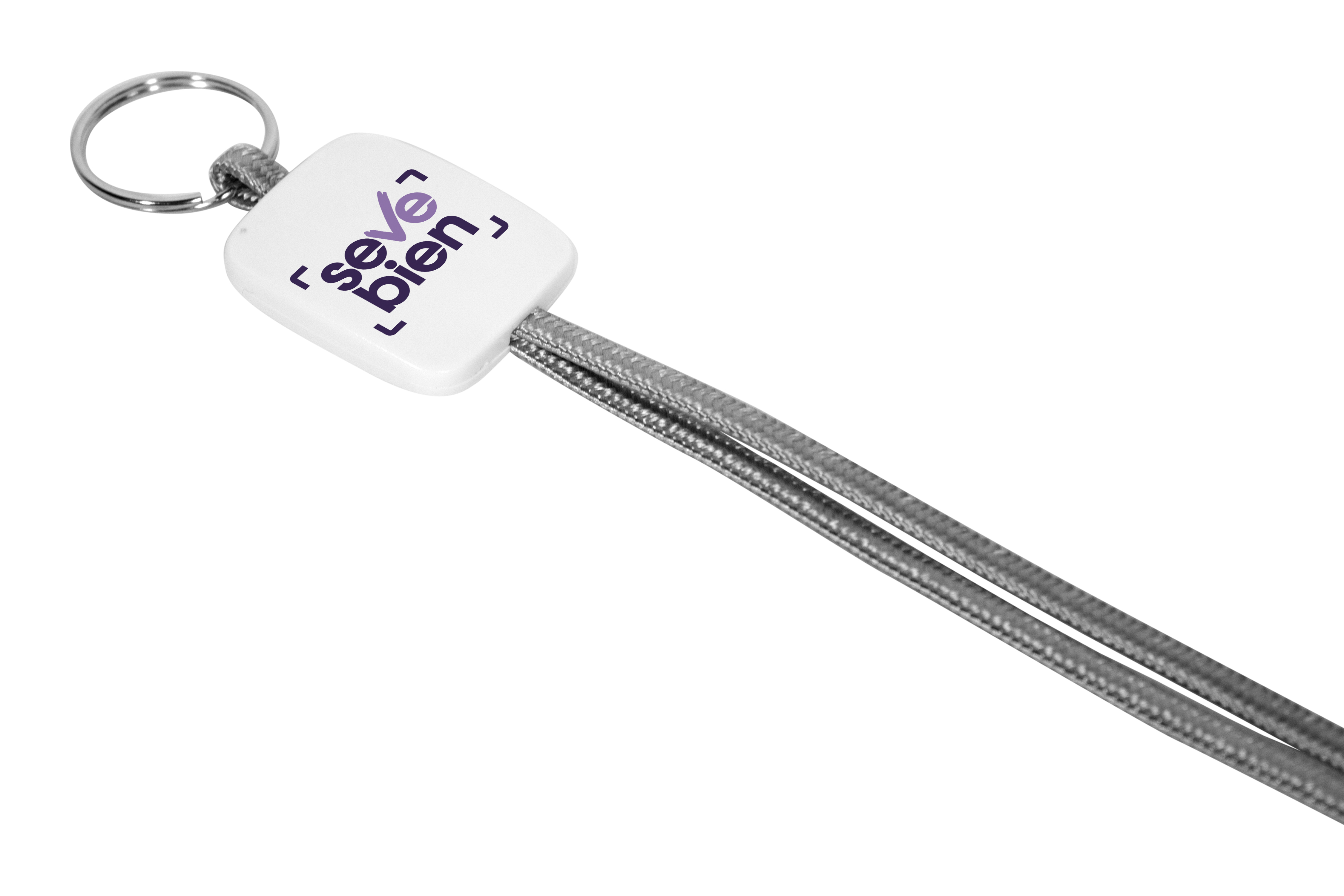 26,5 (medida total del cable con los adaptadores). 3 x 3,5 x 0,4 (medidas del cuadrado plástico donde se aplica el logo). Anillo para enganche o colocar llaves. Cargador tipo C y Iphone. Luz indicadora de carga del celular, cuando el color es rojo la batería del celular posee una carga menor al 50%, azul del 51 al 99% y verde cuando está totalmente cargada.