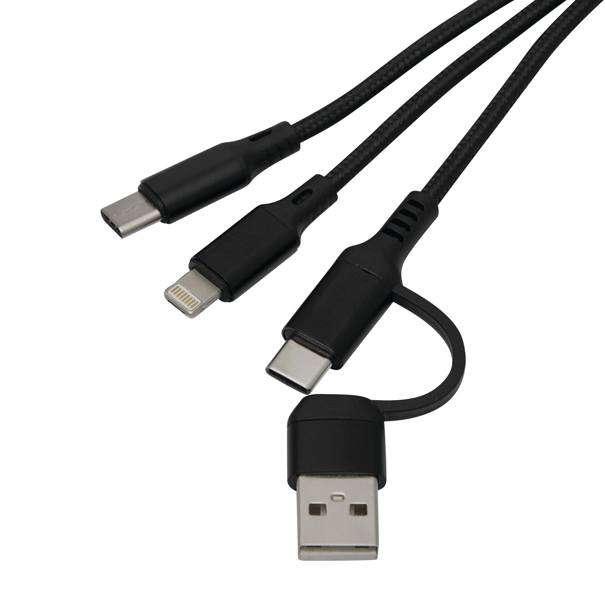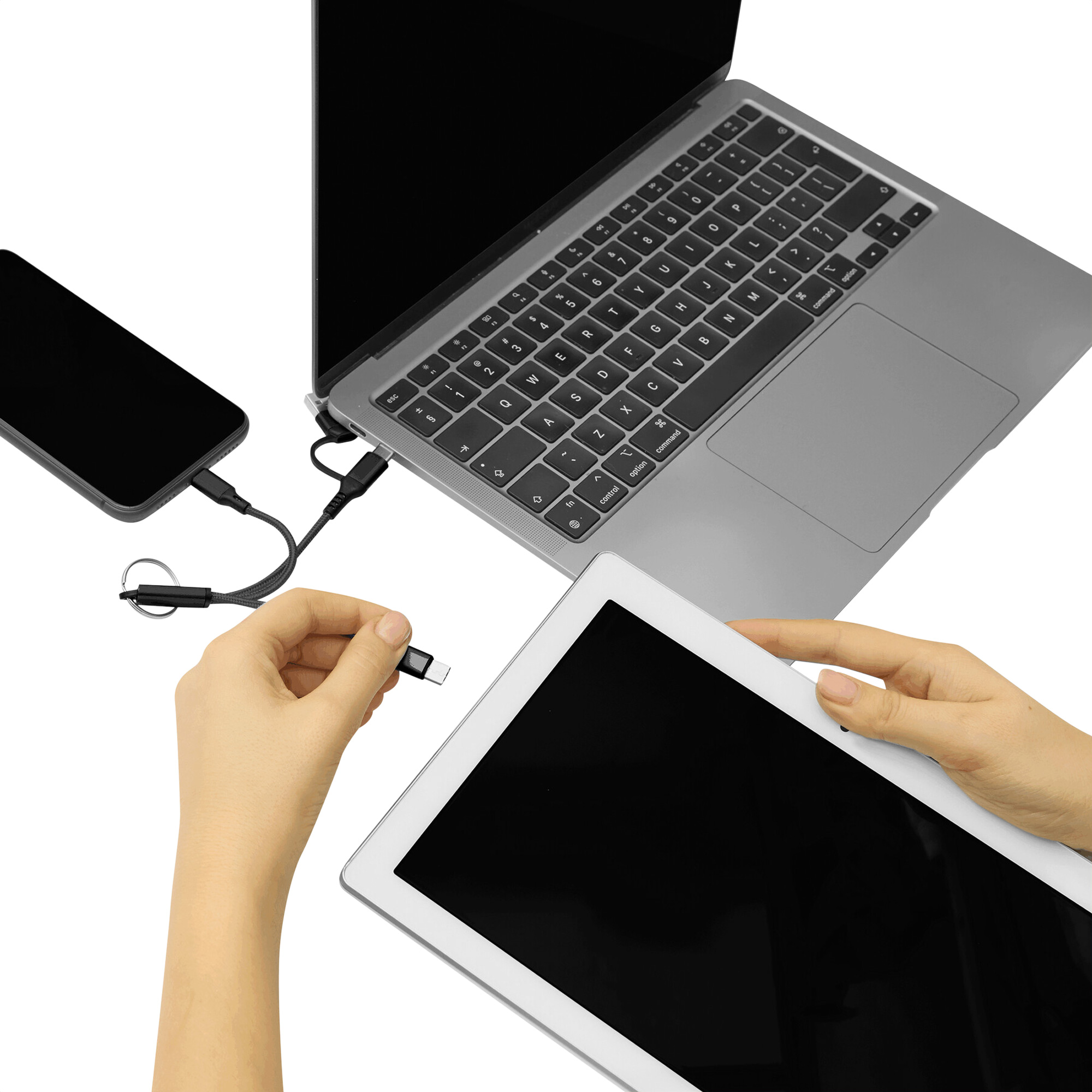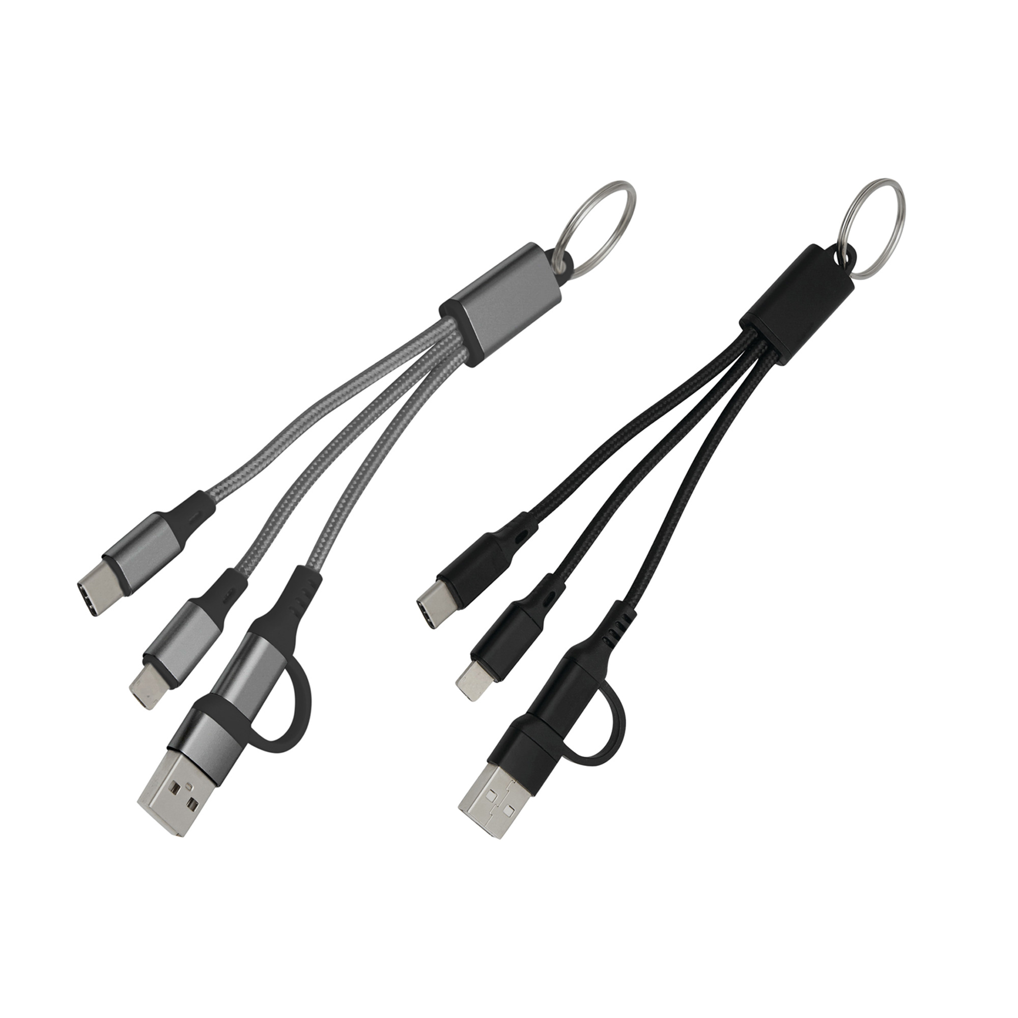 Cable de carga con llavero. Entrada: 2 en 1 (USB + USB tipo C). Salida: USB tipo C + lightning.